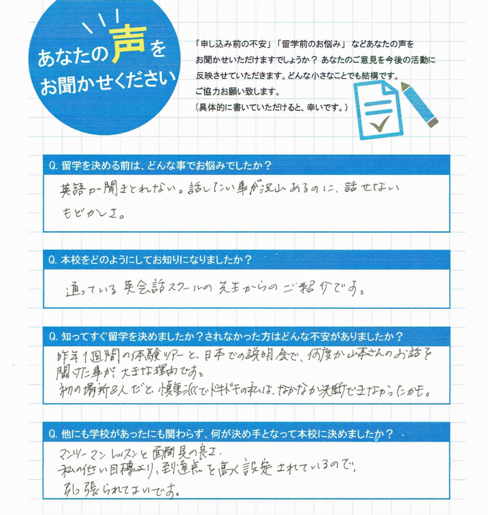 ゆっくりながらも、センテンスを使って話せるようになりました。午前と午後の先生が話し合いながら授業をして頂けたので、抜けがなかった。 しげちん 1ヶ月留学 英語は…