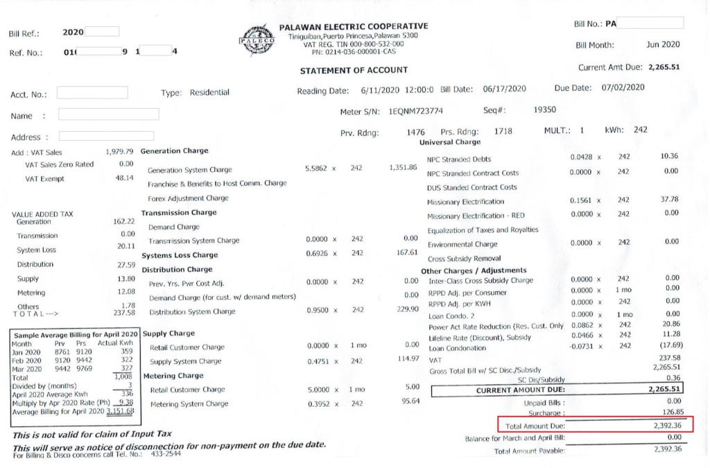 2020年6月の電気代は約2400ペソ。