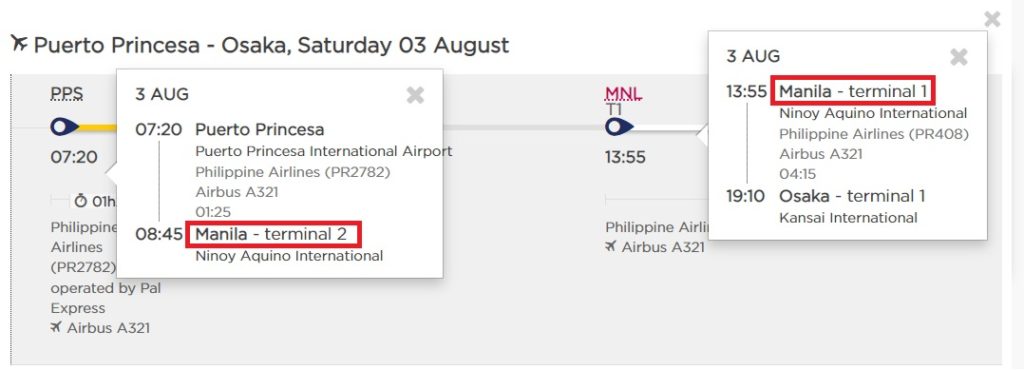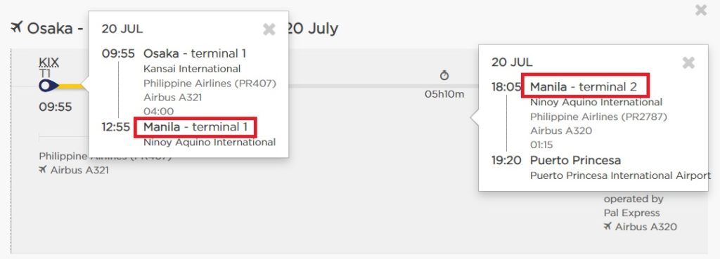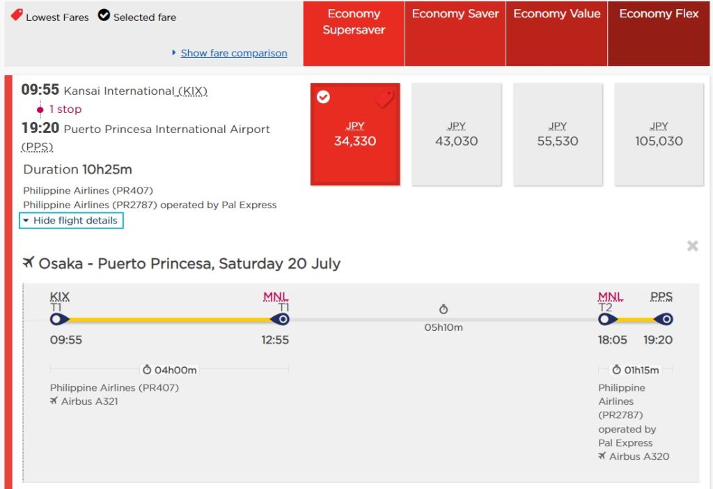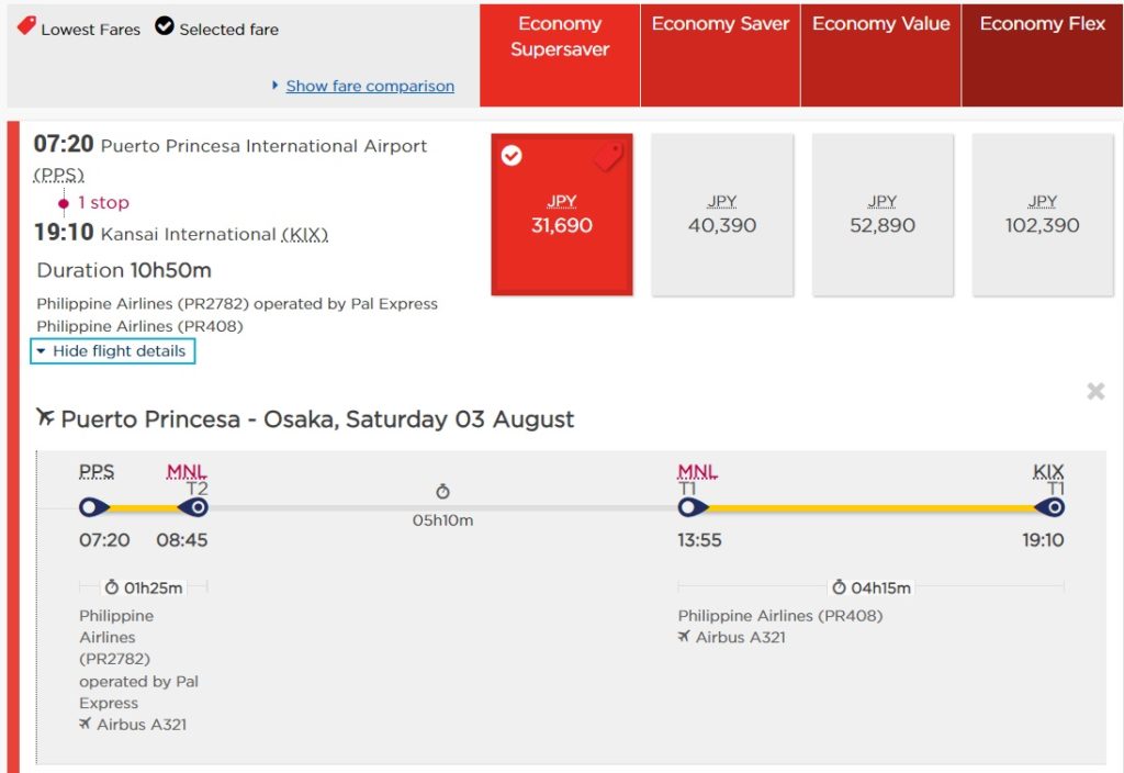 2023年10月23日現在、フィリピン航空でパラワン島プエルトプリンセサ空港に行こうとすると、以下のフライトがベストでした。