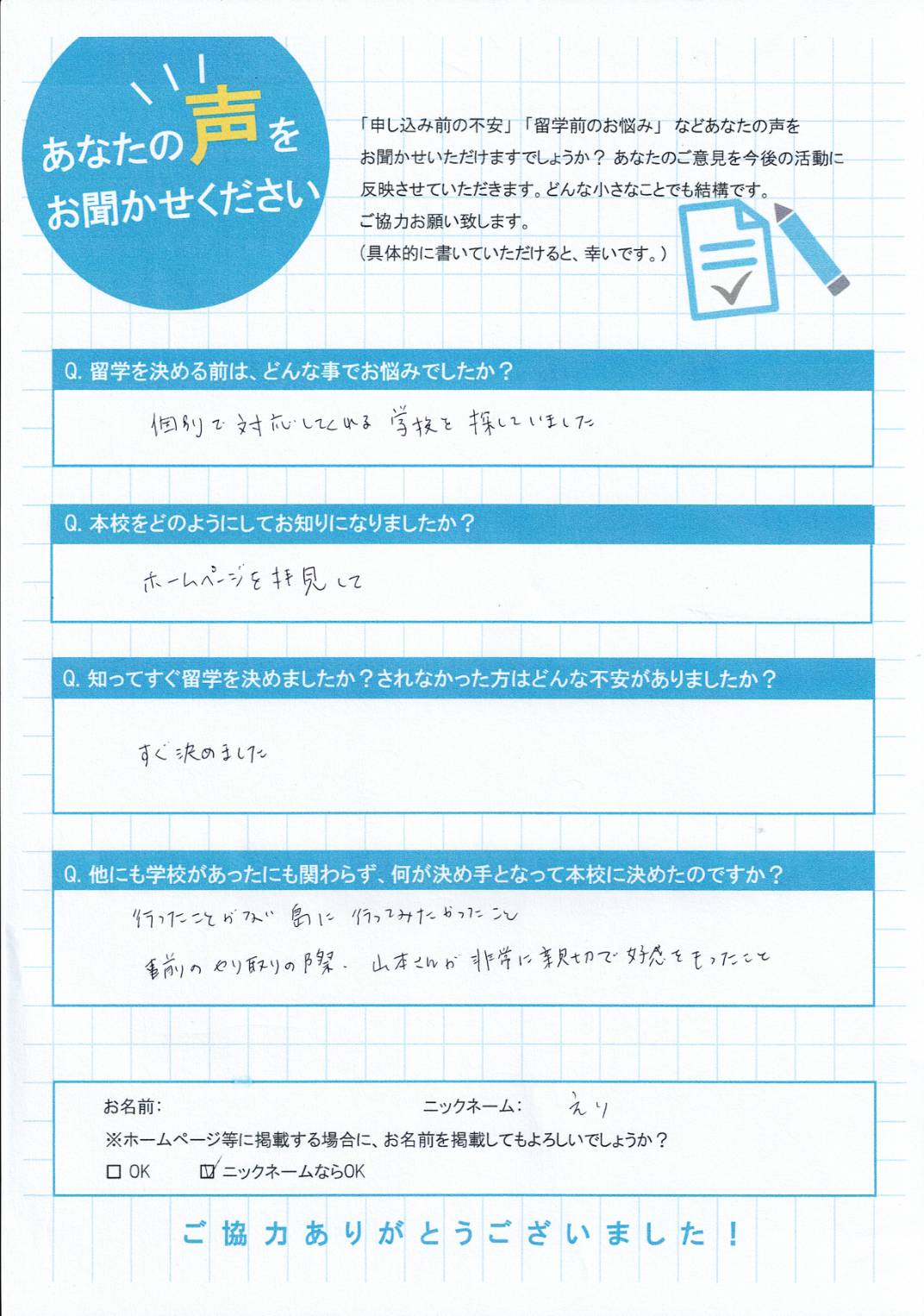 Q.知ってすぐ留学を決めましたか?されなかった場合は、どんな不安がありましたか?