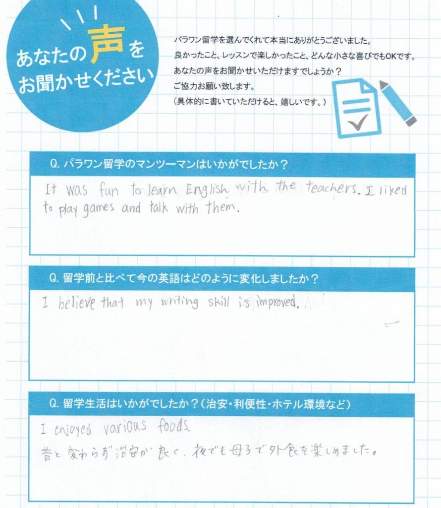 パラワン留学のマンツーマンレッスンはいかがでしたか?