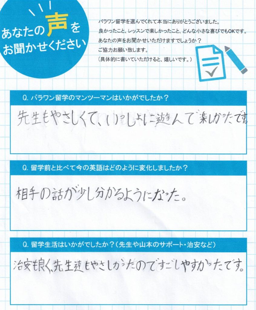 パラワン留学のマンツーマンはいかがでしたか?